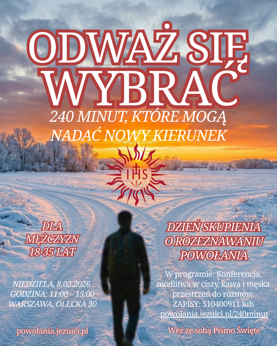 Odważ się Wybrać: 240 minut, które mogą nadać nowy kierunek   Stoisz na rozdrożu? Masz więcej pytań niż odpowiedzi? Czujesz, że Twoje życie potrzebuje konkretnego celu, ale nie wiesz, w którą stronę pójść? Zapraszamy na wyjątkowy dzień skupienia dla mężczyzn w wieku 18–35 lat, poświęcony rozeznawaniu drogi życiowej...